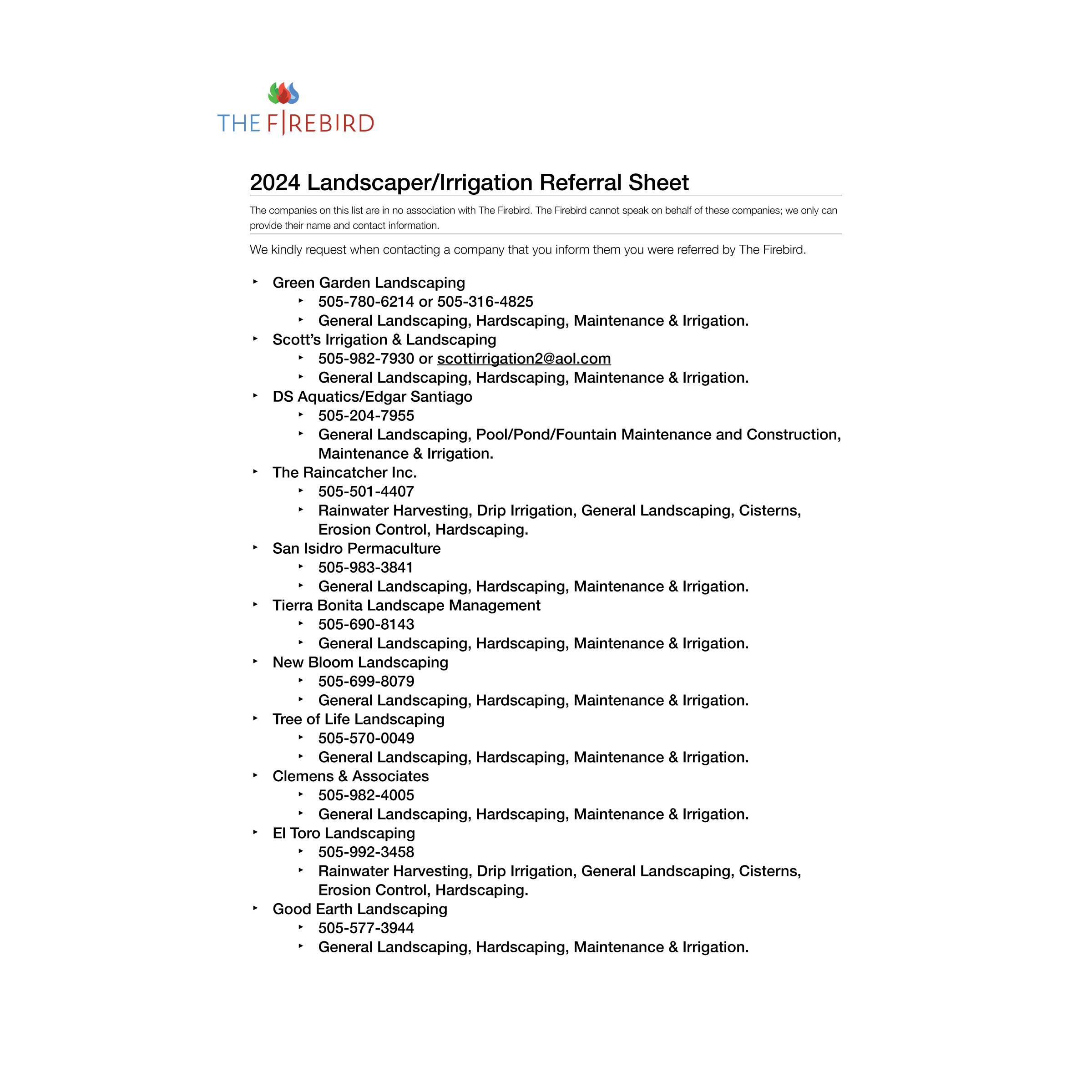 The companies on this list are in no association with The Firebird. The Firebird cannot speak on behalf of these companies; we only can